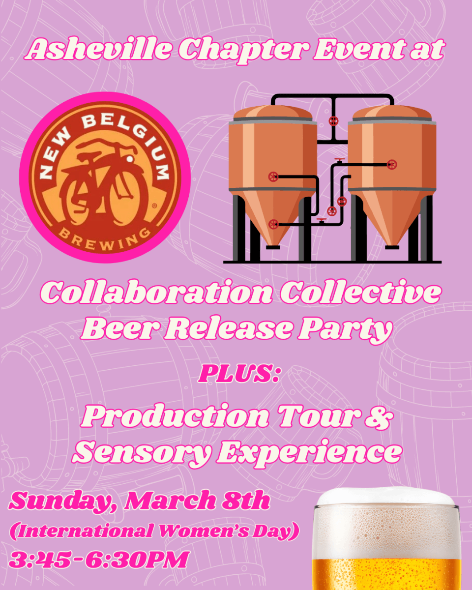 Summary: Come celebrate International Women's Day with the Asheville chapter at New Belgium! Current chapter members are invited to explore New Belgium's brewhouse during a private 90-minute production tour and sensory experience from 4-5:30pm, followed by optional food and drinks at the Liquid Center.