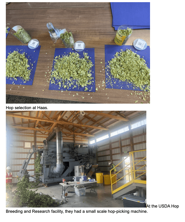 As a lab specialist, the research facilities were a highlight! At Yakima Chief Hops, we saw how breeding and propagation research is directly implemented in the field, including experimental varieties and maintaining virus-free plants. We even made our own media and participated in early propagation steps placing stems into media filled test tubes. At the USDA Hop Breeding and Research facility, we learned about Dr. Kayla Altendorf’s work in genomics-assisted hop breeding. She took us to her lot and we got to tag bines that we thought looked heathy and best to harvest.