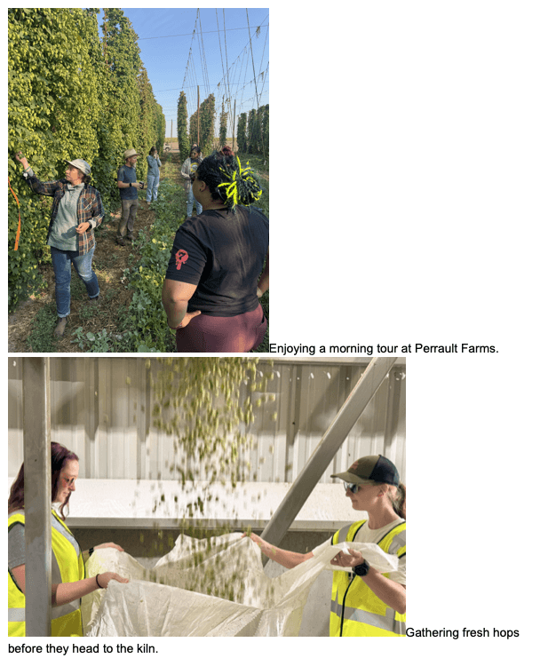 We had four packed days in Yakima, spending most of our time touring hop farms including CLS, Morrier, Sauve & Sons, Double R, and Perrault. Each farmer was welcoming, knowledgeable, and generous with their time. It was fascinating to see the range in scale: some farms were running harvest 24/7 and others had two to three harvesting lines running simultaneously. The technology was equally impressive, whether focused on efficiency, like Perrault’s horizontal systems, or environmental impact. Elizabeth Morrier McGree highlighted Morrier Farms’ sustainability efforts, specifically their water management since Yakima Valley has experienced droughts in 2023 and 2024. One constant across all farms was that they were multi-generational operations- a testament to the pride and tradition in this industry.